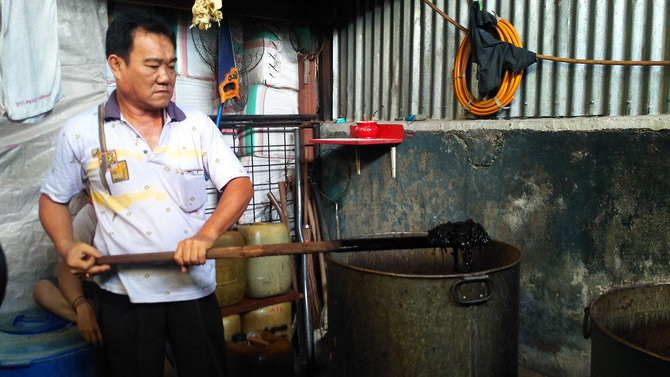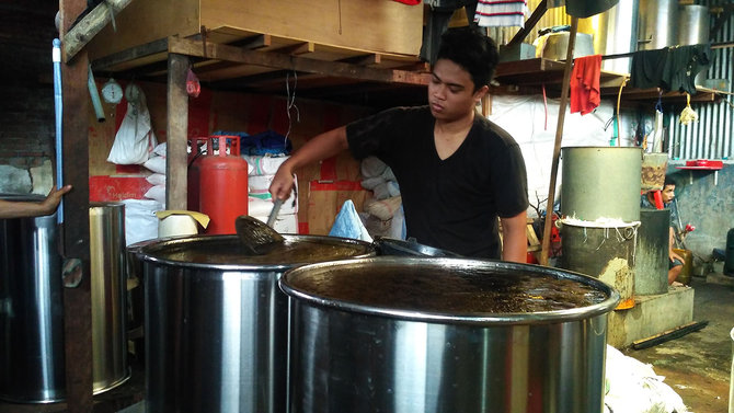 KLIK66 Empat pria tampak sibuk membersihkan kaleng-kaleng tempat membuat cincau. Sedangkan pekerja lain sedang mengambil ampas daun cincau yang dimasak dalam kukusan besar.